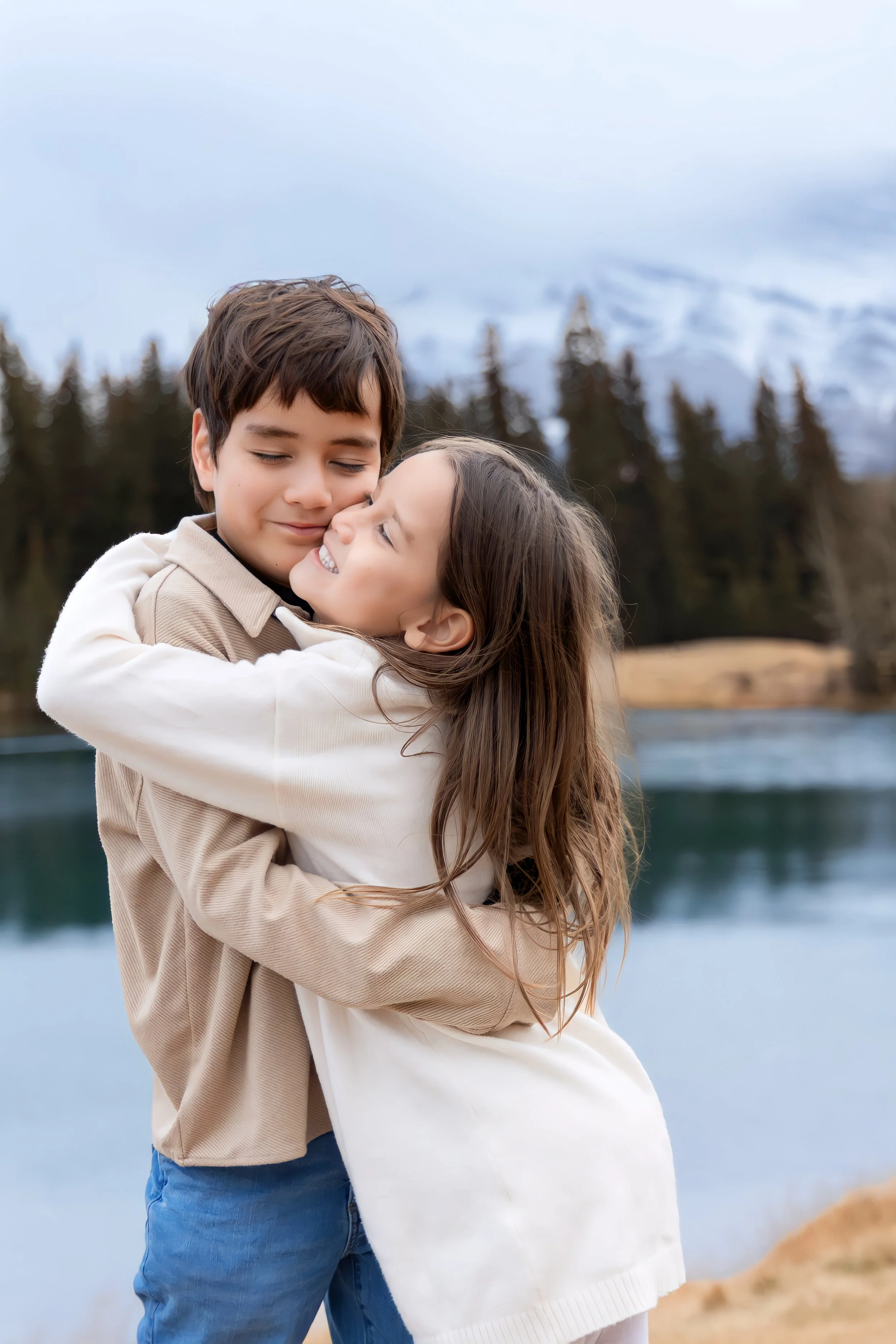 We met at Cascade Ponds just on the way in to Banff, surrounded by quiet water, evergreens, and a beautiful mountain backdrop. Despite the chilly day, these four brought nothing but warmth. And their kids… my heart. When I asked them for a sibling photo together, they immediately wrapped each other up in a big, genuine hug. No prompting, no direction. Just brother–sister love in its purest form. Moments like that remind me why I adore what I do. You can’t pose love like that. You can only catch it when it happens.